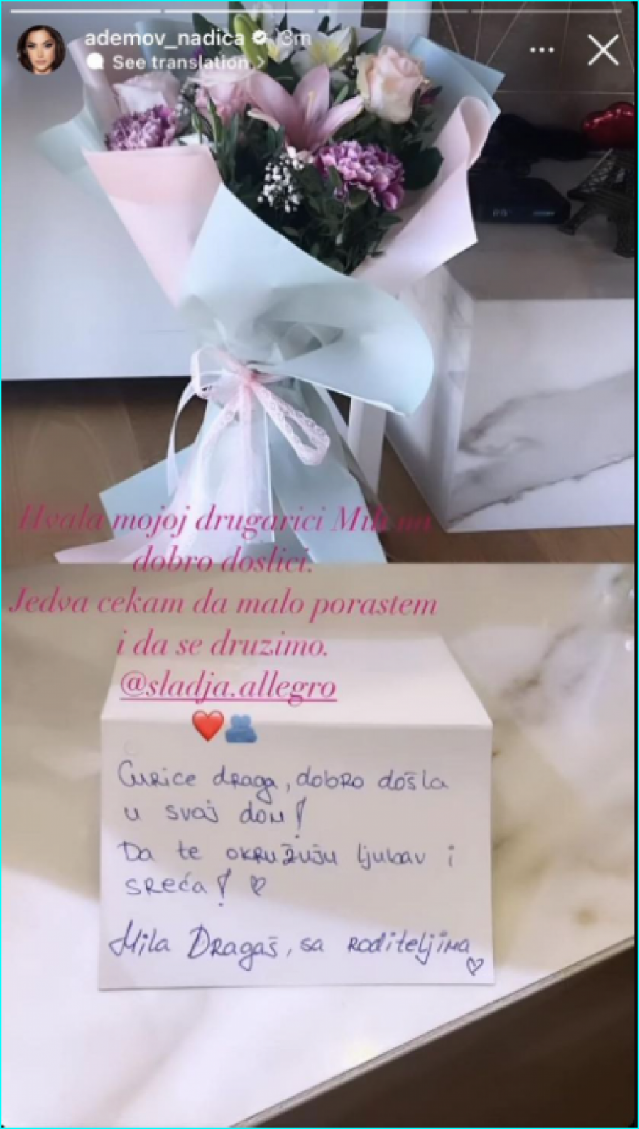 - Curice draga, dobro došla u svoj dom! Da te okružuju ljubav i sreća. Mila Dragaš sa roditeljima - piše u čestitci pored predivnog, roze buketa.