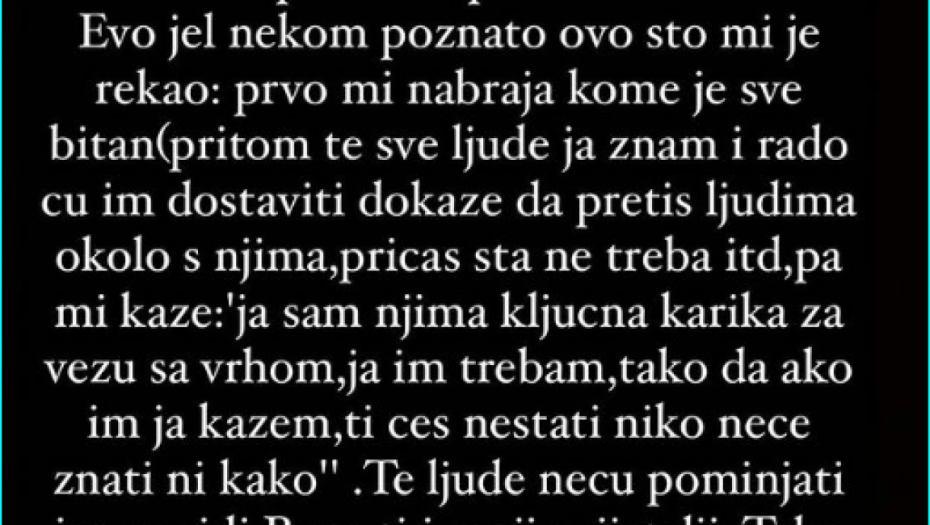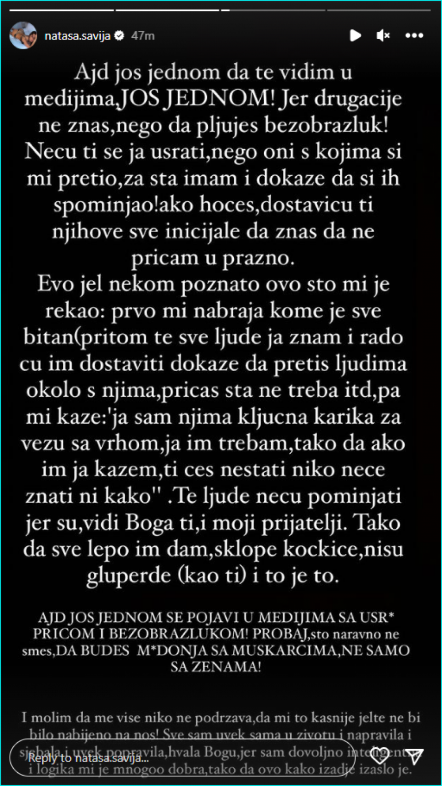 - Hajde još jednom da te vidim u medijima, još jednom! Jer drugačije ne znaš, nego da pljuješ bezobrazluk! Neću ti se ja u*rati, nego oni s kojima si mi pretio, za šta imam i dokaze da si ih spominjao! Ako hoćeš, dostaviću ti njihove sve inicijale da znaš da ne pričam u prazno. Evo da li je nekom poznato ovo što mi je rekao: prvo mi nabraja kome je sve bitan (pritom te sve ljude ja znam i rado ću im dostaviti dokaze da pretiš ljudima okolo s njima, pričaš šta ne treba itd, pa mi kaže: 'ja sam njima ključna karika za vezu sa vrhom, ja im trebam, tako da ako im ja kažem, ti ćeš nestati niko neće znati ni kako". Te ljude neću pominjati jer su, vidi Boga ti, i moji prijatelji. Tako da sve lepo im dam, sklope kockice, nisu gluperde (kao ti) i to je to. I molim da me više niko ne podržava, da mi to kasnije jelte ne bi bilo nabijeno na nos! Sve sam uvek sama u životu i napravila i s**bala i uvek popravila, hvala Bogu, jer sam dovoljno inteligentna i logika mi je mnogo dobra, tako da ovo kako izađe izašlo je - napisala je ona, ali se tu nije zaustavila.