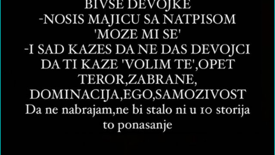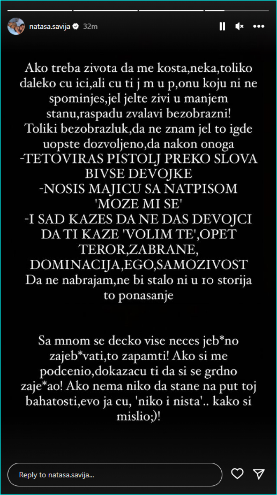- Ako treba života da me košta, neka, toliko daleko ću ići, ali ću ti j m u p, onu koju ni ne spominješ, jer jelte živi u manjem stanu, raspadu žvalavi bezobrazni! Toliki bezobrazluk, da ne znam jel to igde uopšte dozvoljeno, da nakon onoga tetoviraš pištolj preko slova bivše devojke, nosiš majicu sa natpisom "može mi se", i sad kažeš da ne daš devojci da ti kaže "volim te". Opet teror, zabrane, dominacija, ego, da ne nabrajam. Sa mnom se dečko više nećeš j**no za*ebavati, to zapamti! Ako si me potcenio, dokazaću ti da si se grdno zaje*ao! Ako nema niko da stane na put toj bahatosti, evo ja ću, 'niko i ništa' - napisala je ona.
