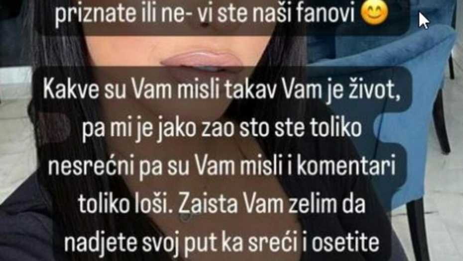 - Važno obaveštenje. Za sve ljude koji izdvoje vreme da otvore naš post, pogledaju i izdvoje vreme da komentarišu, hteli vi to da priznate ili ne - vi ste naši fanovi. Kakve su vam misli takav vam je život, pa mi je žao što ste toliko nesrećni, te su vam i misli i komentari jako loši. Zaista vam želim da nađete svoj put ka sreći i osetite lepotu života. Od sada će svako od vas biti blokiran jer kako bih vam rekla - tako sam u mogućnosti - napisala je Kaća, prenosi Kurir.