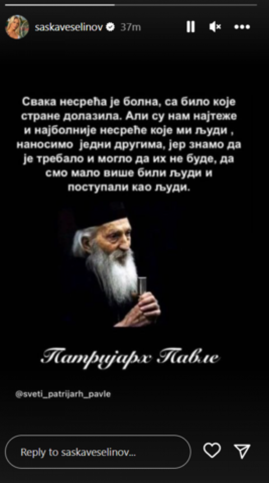 Sada je, međutim, Saška objavila citat pokojnog patrijarha Pavla, čiji je veliki poštovalac, a tiče se nesreća koje ljudi jedni drugima nanose, te verujemo da je aludirala na rat koji se vodi u pojasu Gaze, kao i na nedužnu decu koja stradaju.