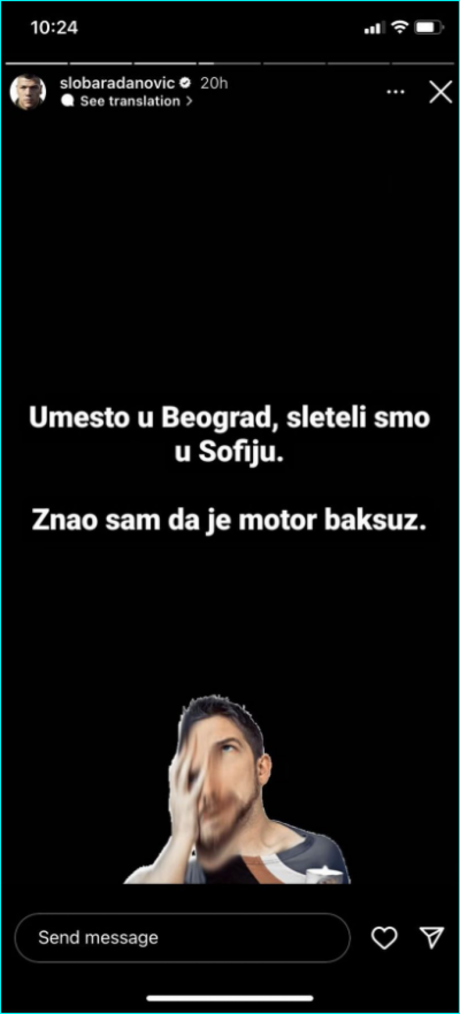 - Umesto u Beograd, sleteli smo u Sofiju. Znao sam da je motor baksuz - poručio je Radanović, a onda slikao sebe kako izgleda nakon turbulencija. Pevača vidimo čupavog, bledog i umornog.