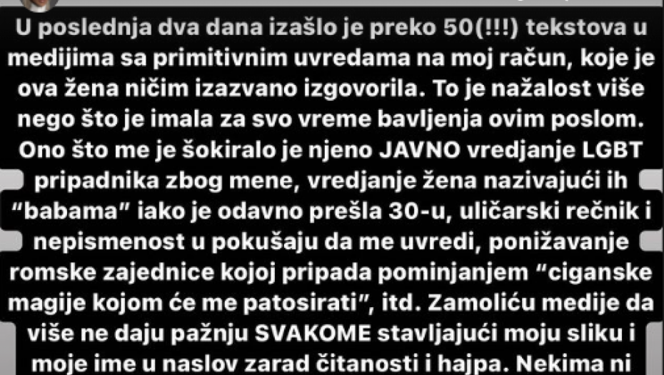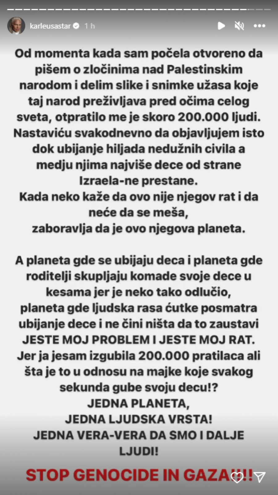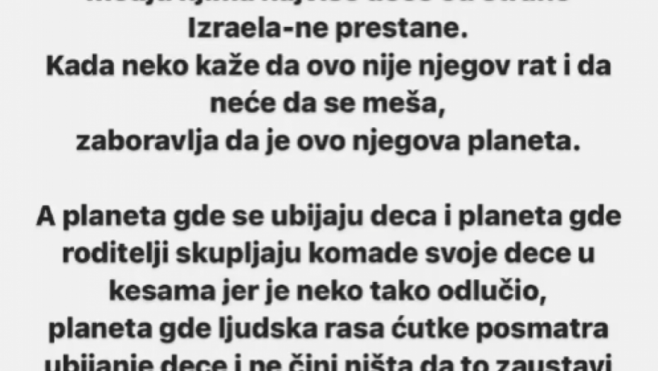 - Od momenta kada sam počela otvoreno da pišem o zločinima nad Palestinskim narodom i delim slike i snimke užasa koje taj narod preživljava pred očima celog sveta, otpratilo me je skoro 200.000 ljudi. Nastaviću svakodnevno da objavljujem isto dok ubijanje hiljade nedužnih civila, a među njima najviše dece, od strane Izraela ne prestane. Kada neko kaže da ovo nije njegov rat i da neće da se meša, zaboravlja da je ovo njegova planeta. A planeta gde se ubijaju deca i planeta gde roditelji skupljaju komade svoje dece u kesama jer je neko tako odlučio, planeta gde ljudska rasa ćutke posmatra ubijanje dece i ne čini ništa da to zaustavi jeste moj problem i jeste moj rat. Jer ja jesam izgubila 200.000 pratilaca, ali šta je to u odnosu na majke koje svakog sekunda gube svoju decu? Jedna planeta, jedna ljudska vrsta, jedna vera - vera da smo i dalje ljudi. Zaustavite genocid u Gazi - napisala je slomljena Jelena na svom Instagramu.