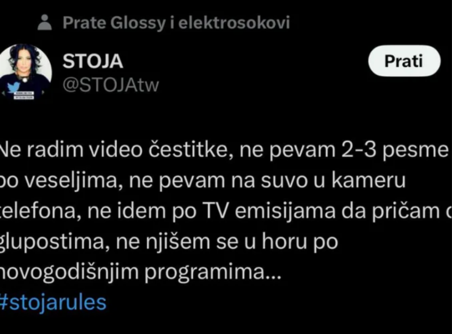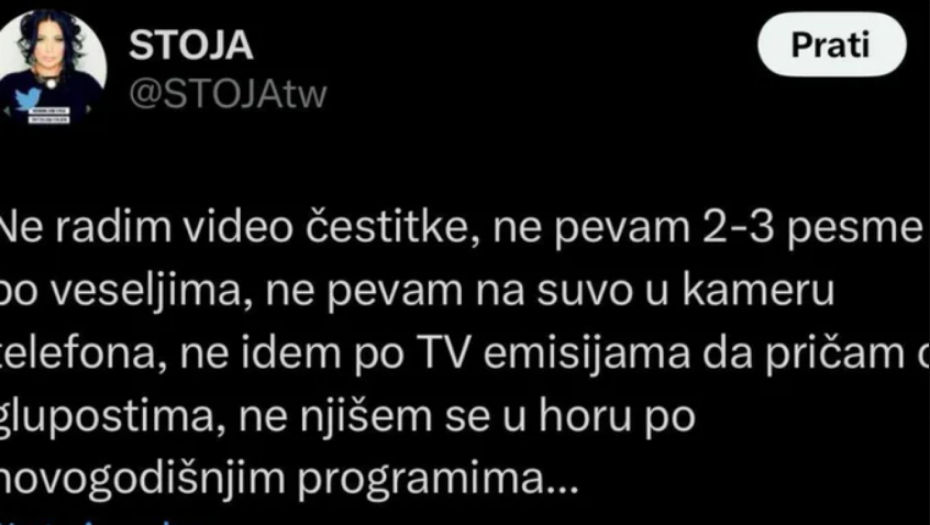 - Ne radim video čestitke, ne pevam 2-3 pesme po veseljima, ne pevam na suvo u kameru telefona, ne idem po TV emisijama da pričam o glupostima, ne njišem se u horu po novogodišnjim programima -napisala je folkerka uz hešteg Stojina pravila.