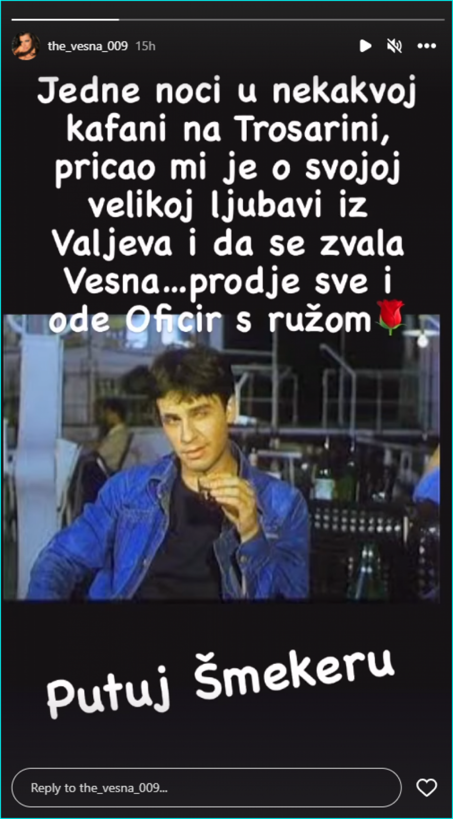 - Jedne noći u nekakvoj kafani na Trošarini, pričao mi je o svojoj velikoj ljubavi iz Valjeva i da se zvala Vesna. Prođe sve i ode oficir sa ružom. Putuj, šmekeru - napisala je Vesna na svom Instagram profilu uz fotografiju preminulog Lauševića.