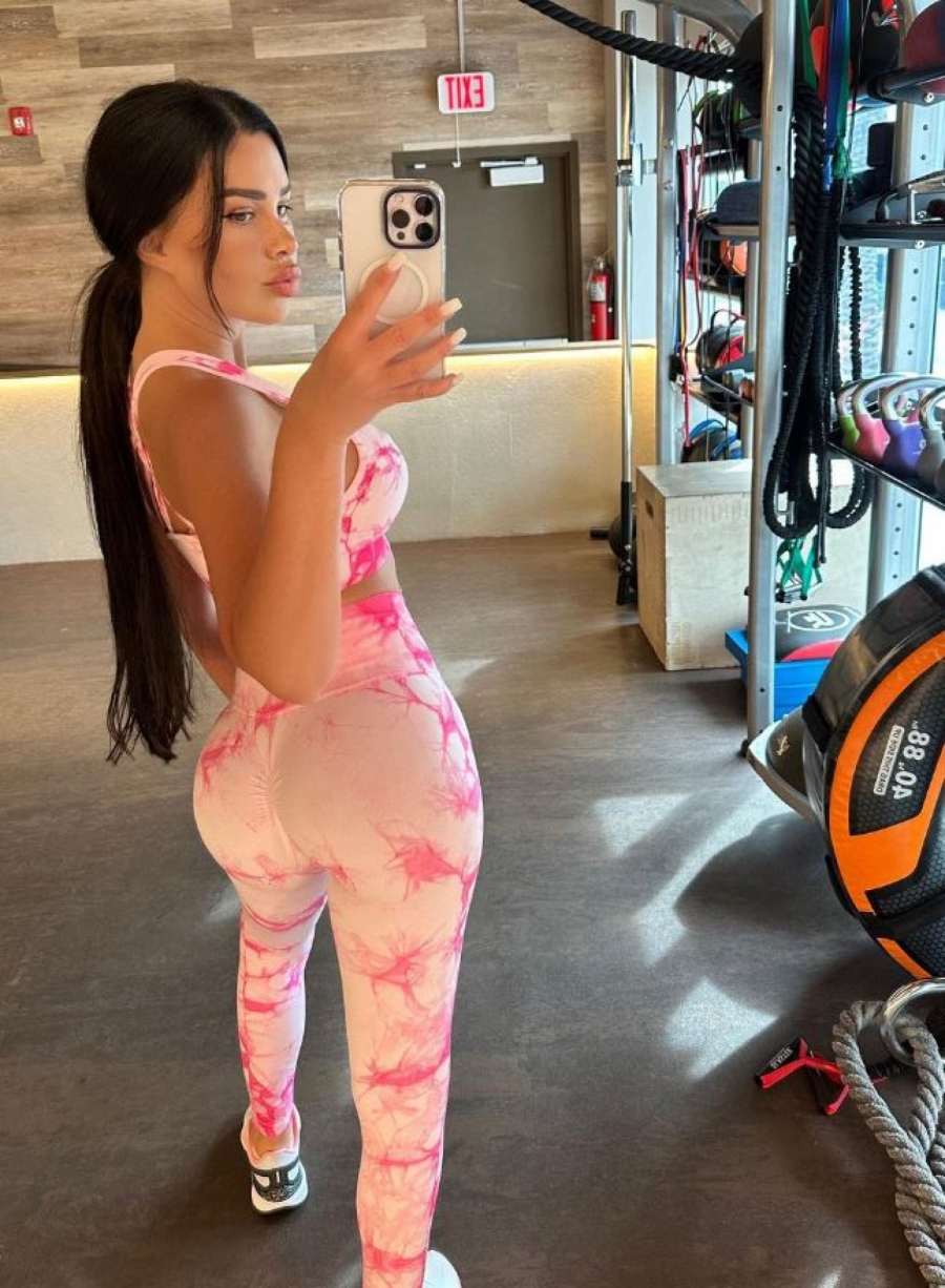 Ovog puta starleta je odlučila da pozira u kompletu za trening koji oidrazumeva helanke i top u roze-beloj boji.