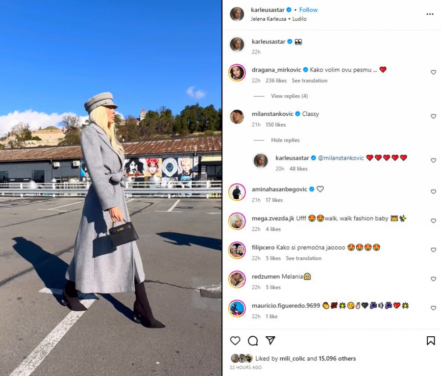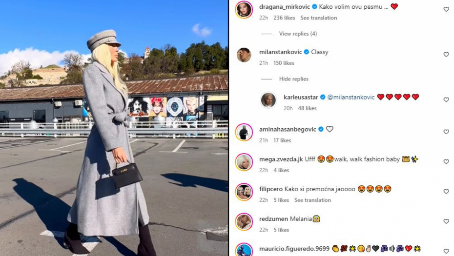 Karleuša je podelila video-snimak na kom se vidi kako šeta Beogradom u dugom sivom kaputu i beretkom na glavi iste boje, a Stanković joj je uputio kompliment.