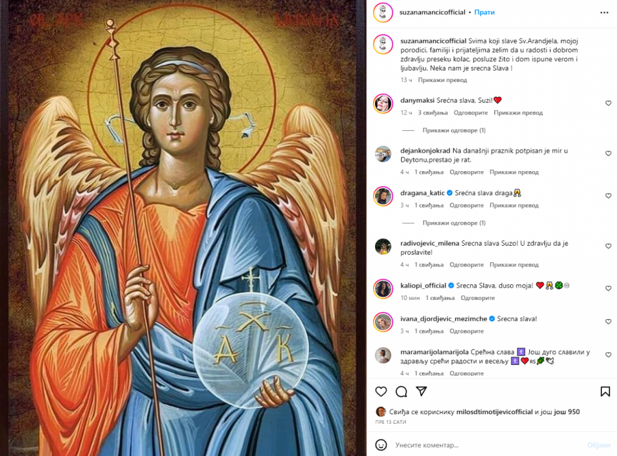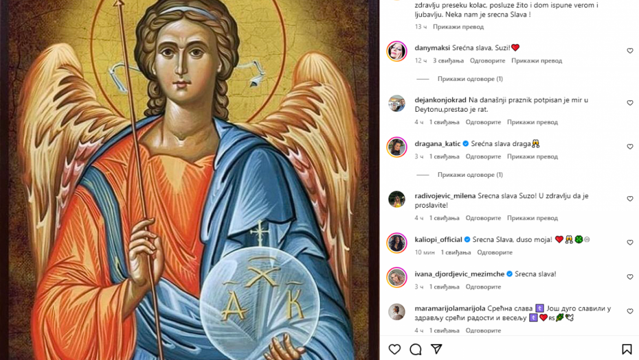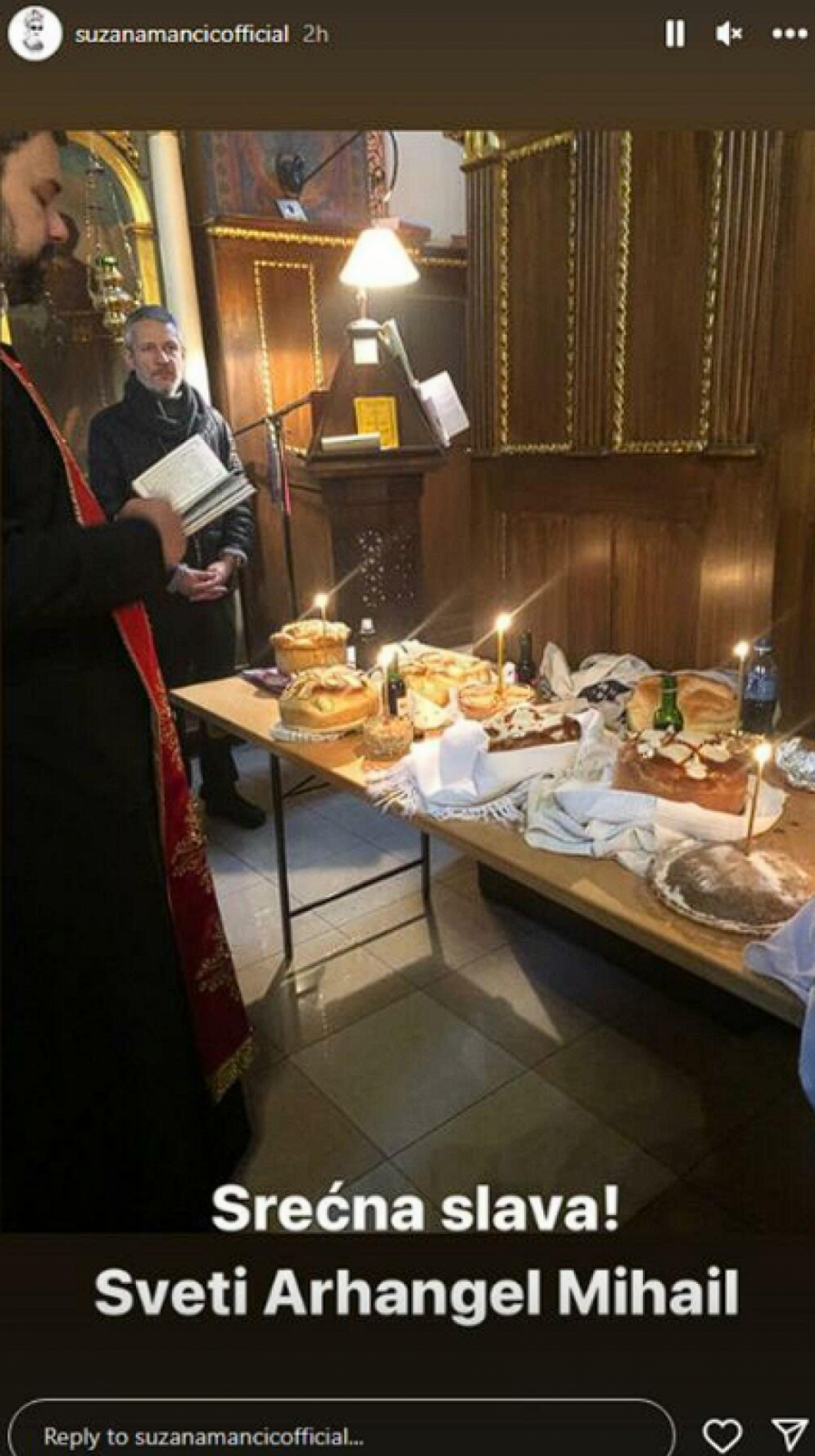 - Svima koji slave Sv.Arandjela, mojoj porodici, familiji i prijateljima želim da u radosti i dobrom zdravlju preseku kolač, posluže žito i dom ispune verom i ljubavlju.Neka nam je srećna Slava, napisala je Suzana na svom instagram profilu.