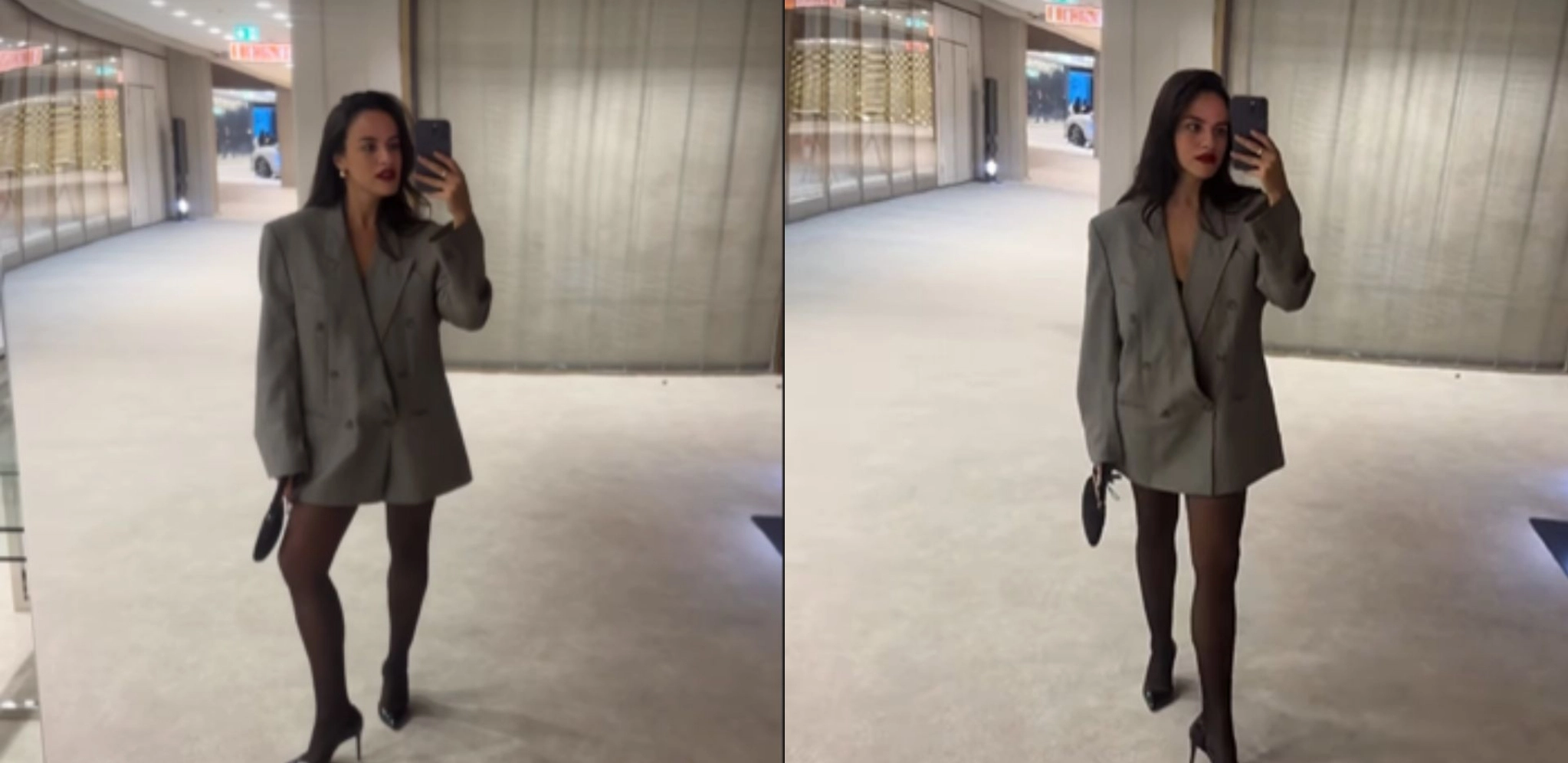 Pošto je sako bio veliki, ona ga je nosila kao haljinu, koju je iskombinovala sa salonkama.