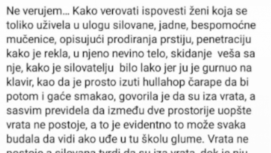 Koja farsa i razapinjanje čoveka bez suda. Jadna je toliko povređena da je ostala do faksa u toj školi, čak posle silovanja dovela i sestru!!! Sa druge strane, nigde je nije bilo do optužbe a od tada ne silazi sa ekrana. Koji užas i nepravda.