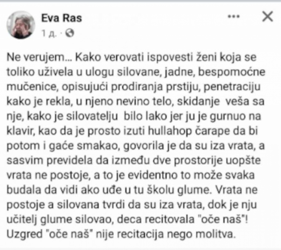 - Ne verujem… Kako verovati ispovesti ženi koja se toliko uživela u ulogu silovane, jadne, bespomoćne mučenice, opisujući prodiranja prstiju, penetraciju kako je rekla, u njeno nevino telo, skidanje veša sa nje, kako je silovatelju bilo lako jer ju je gurnuo na klavir, kao da je prosto izuti hullahop čarape da bi potom i gaće smakao, govorila je da su iza vrata, a sasvim previdela da između dve prostorije uopšte vrata ne postoje, a to je evidentno to može svaka budala da vidi ako uđe u tu školu glume. Vrata ne postoje a silovana tvrdi da su iza vrata, dok je nju učitelj glume silovao, deca recitovala "oče naš"! Uzgred "oče naš" nije recitacija nego molitva - napisala je Eva i izazvala bes javnosti koje je ostala šokirana na ove reči poznate glumice.