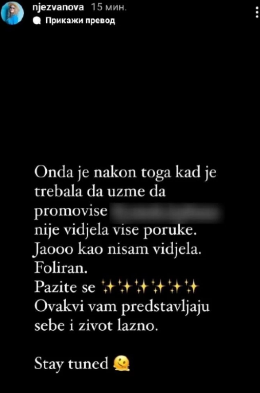 - Onda je nakon toga kad je trebalo da uzme da promoviše (proizvod), nije videla više poruke. Jao, kao nisam videla. Folirant. Pazite se. Ovakvi vam lažno predstavljaju sebe i život lažno.