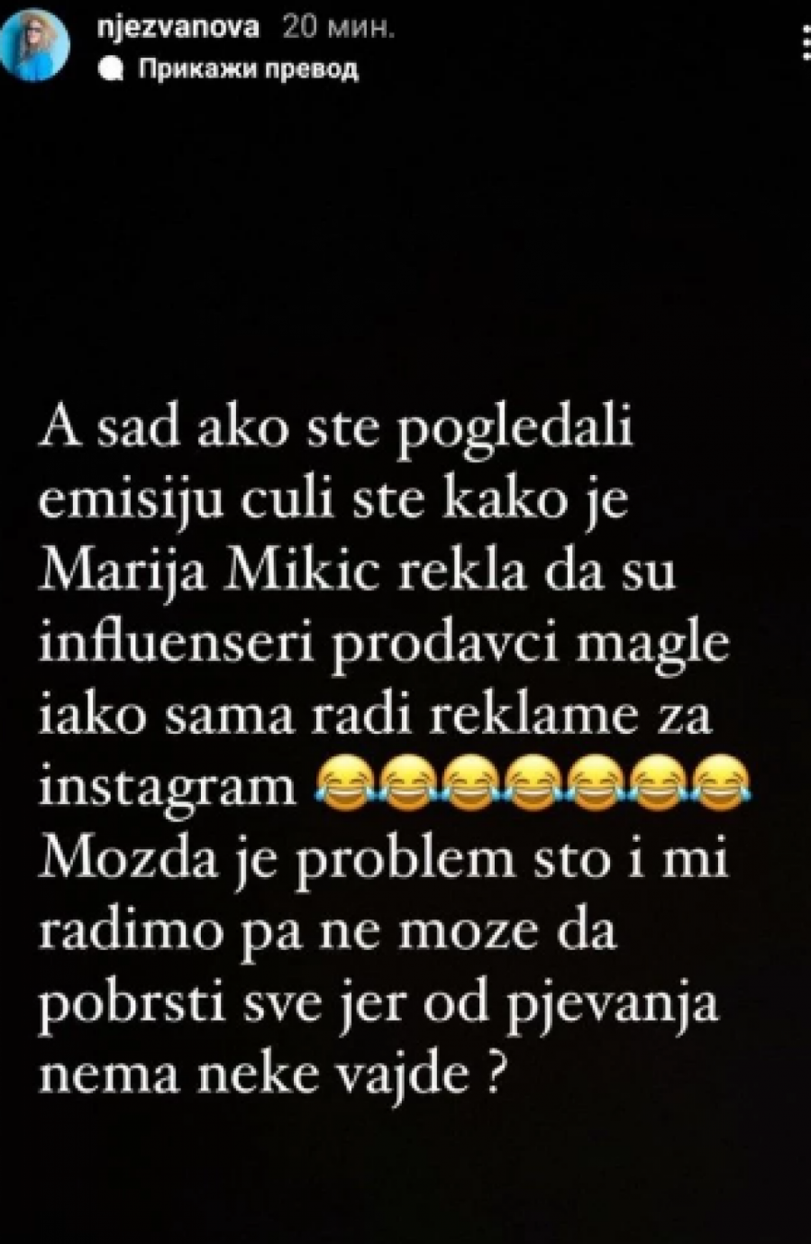 - A sad ako ste pogledali emisiju, čuli ste kako je Marija Mikić rekla da su influenseri prodavci magle, iako sama radi reklame za Instagram. Možda je problem što i mi radimo, pa ne može da pobrsti sve, jer od pevanja nema neke vajde? - krenula je Njezvanova.