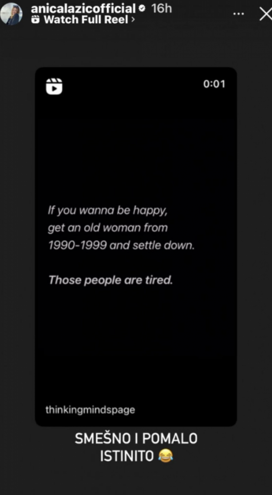 "Ako želite da budete srećni, pronađite staru ženu od 1990. do 1999. i smirite se. Ti ljudi su umorni", podelila je Anica sa "instagramerima". Ispod je napisala: "Smešno i pomalo istinito".