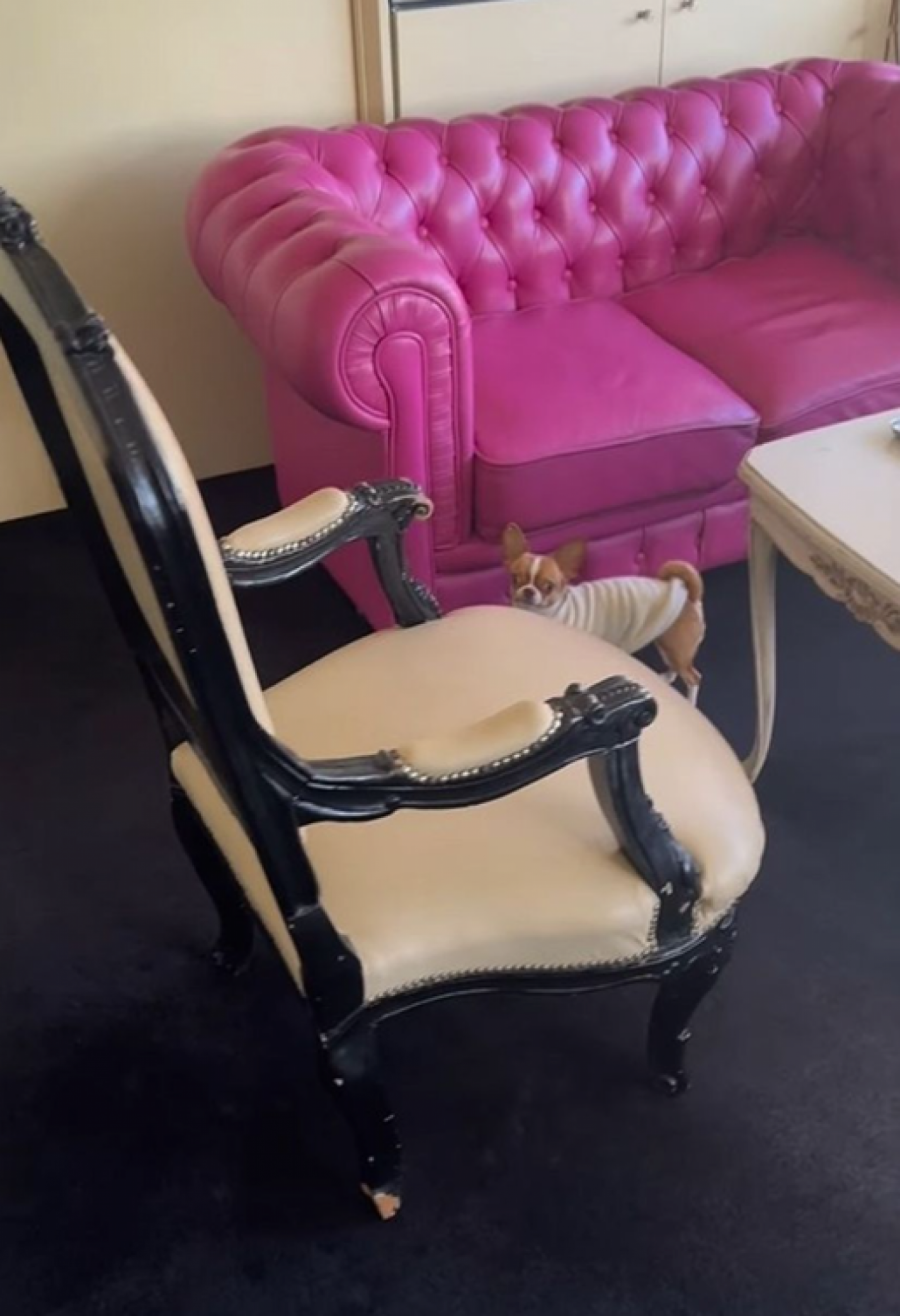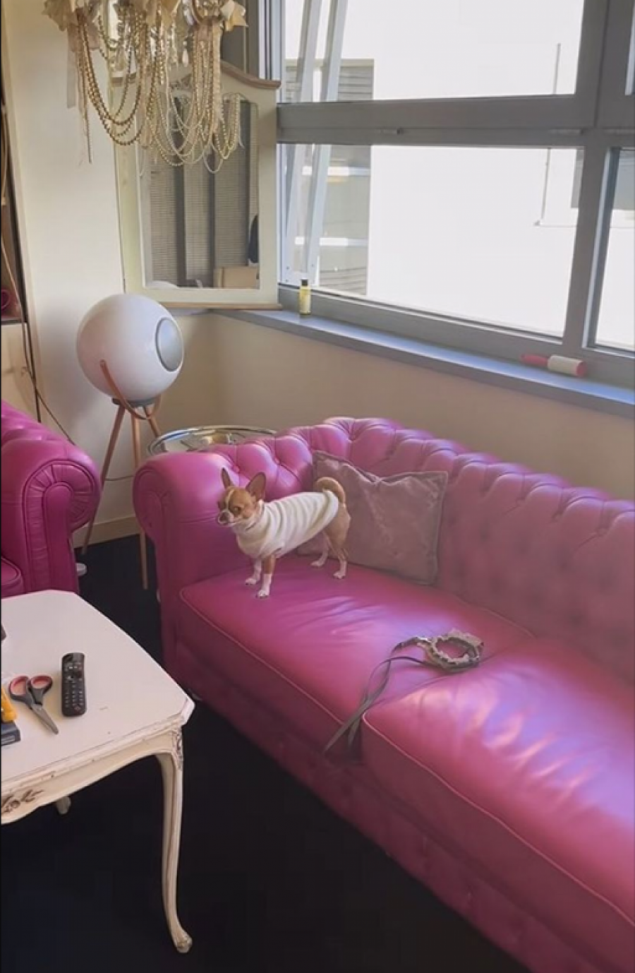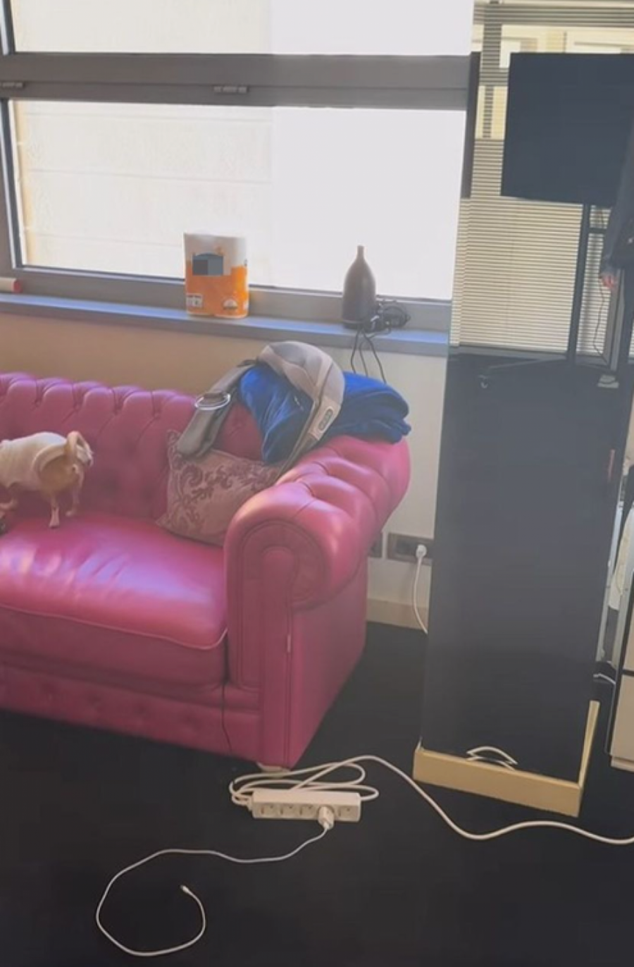 Stilski nameštaj, staklo i drvo dominiraju luksuzno opremljenom kancelarijom, uz naravno dve kožne garniture u roze boji.