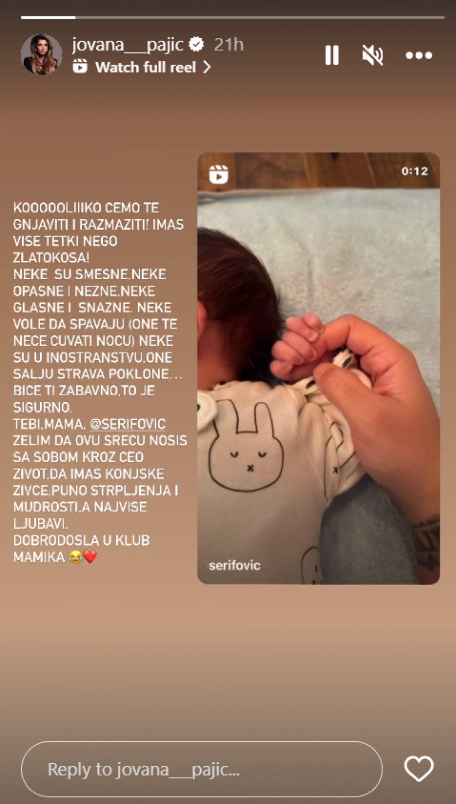 - Biće ti zabavno, to je sigurno... Tebi, mama, želim da ovu sreću sa sobom nosiš kroz ceo život! Da imaš konjsle živce, puno strpljenja i mudrosti, a najviše ljubavi... Dobrodošla u klub, mamika - napisala je Jovana na Instagramu.