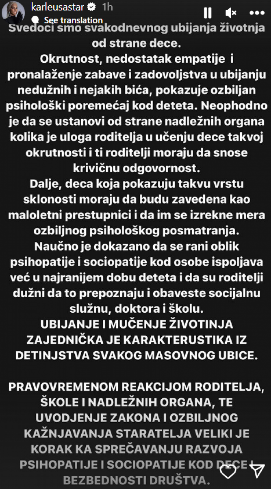 - Naučno je dokazano da se rani oblik psihopatije i sociopatije kod osobe ispoljava već u najranijem dobu deteta i da su roditelji dužni da to prepoznaju i obaveste socijalnu službu, direktora i školu. Ubijanje i mučenje životinja zajednička je karakteristika iz detinjstva svakog masovnog ubice. Pravovremenom rekacijom roditelja, škole i nadležnih organa, te uvođenje zakona i ozbiljnog kažnjavanja staratelja veliki je korak ka sprečavanju razvoja psihopatije i sociopatije kod dece i bezbednosti društva - napisala je ona.