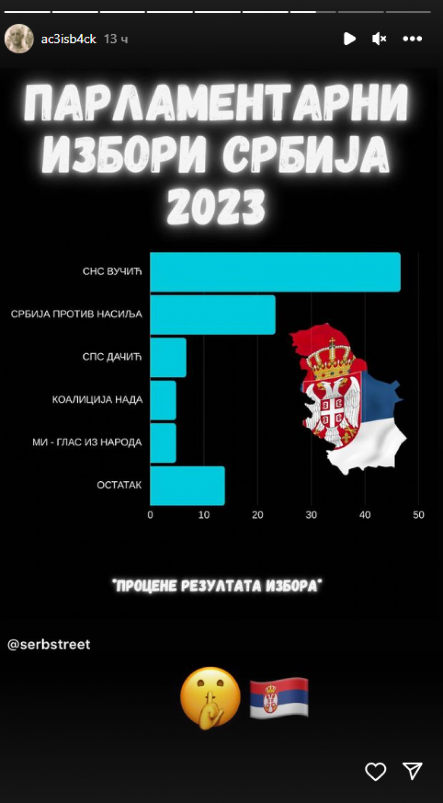 Apsolutnu većinu ima Izborna lista Aleksandar Vučić - Srbija ne sme da stane koja je osvojila 46,75 odsto glasova, a poruku podrške podelio je i bokser Veljko Ražnatović, sin Svetlane Cece Ražnatović.