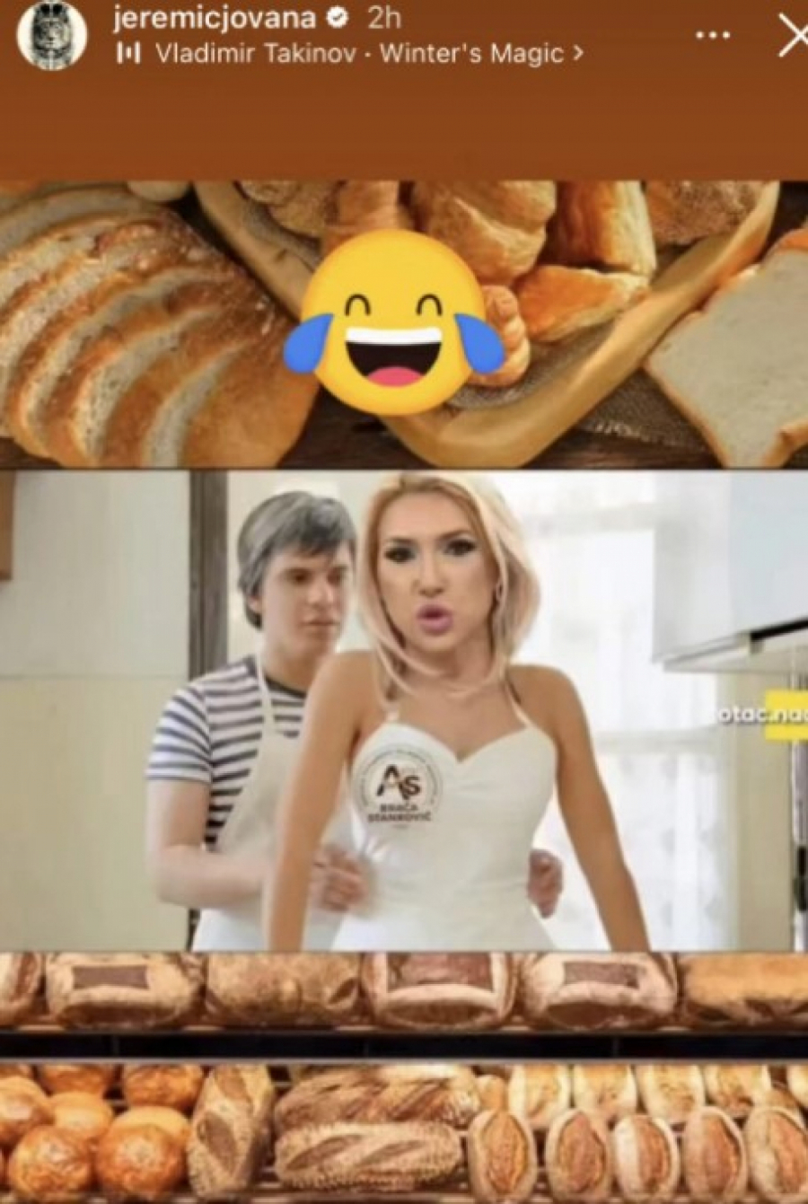 Ova montaža je očigledno nastala jer je Jovanin novi partner vlasnik niza pekara, a Jovana je "njegova Jagodinka". Jeremićeva na kecelji ima logo Draganove pekare.