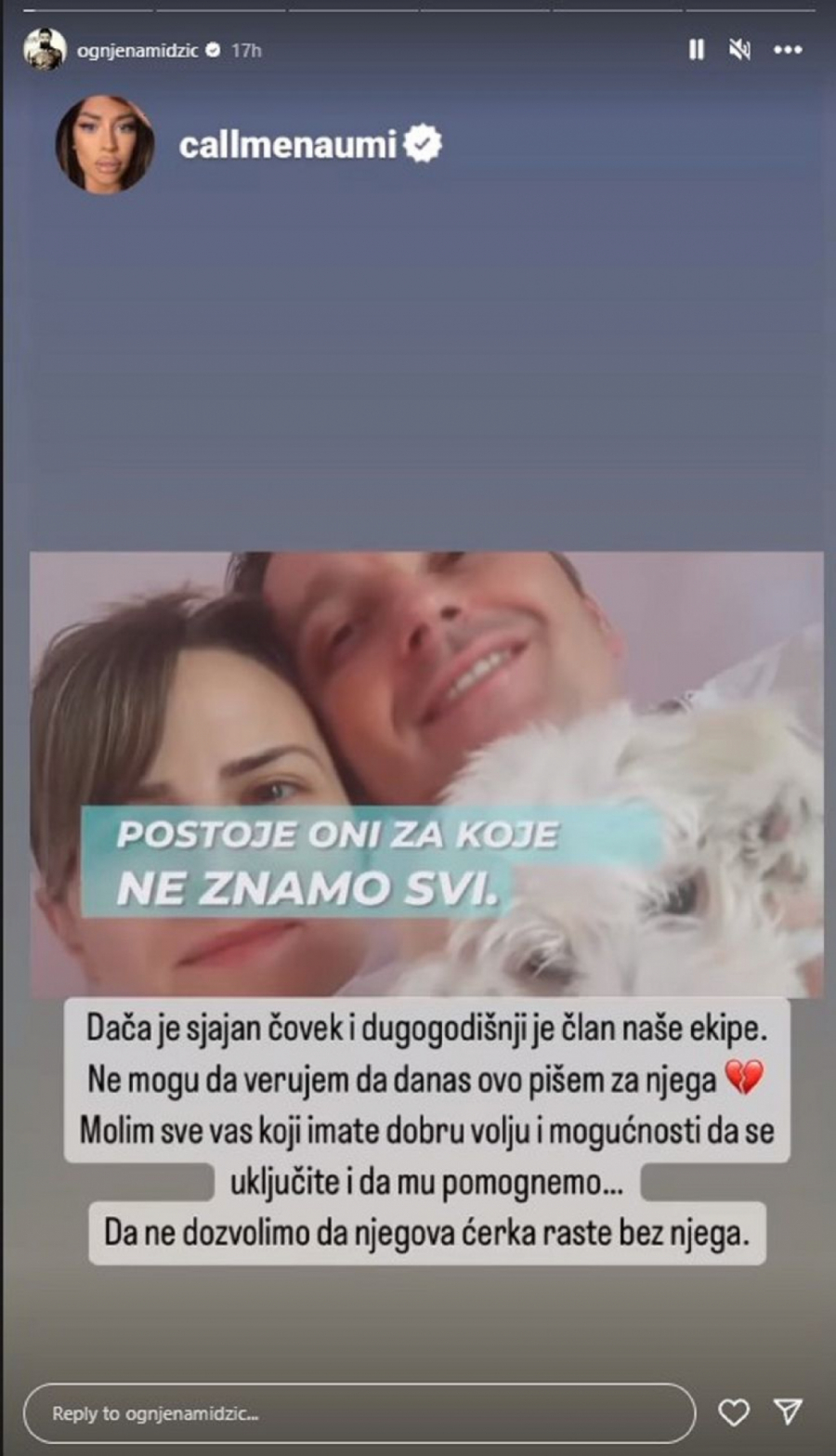 - Dača je sjajan čovek i dugogodišnji je član naše ekipe. Ne mogu da verujem da danas ovo pišem za njega. Molim sve vas koji imate dobru volju i mogućnosti da se uključite i da mu pomognemo. Da ne dozvolimo da njegova ćerka raste bez njega - napisala je Mina.