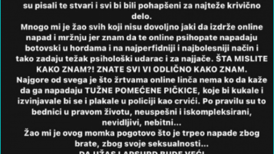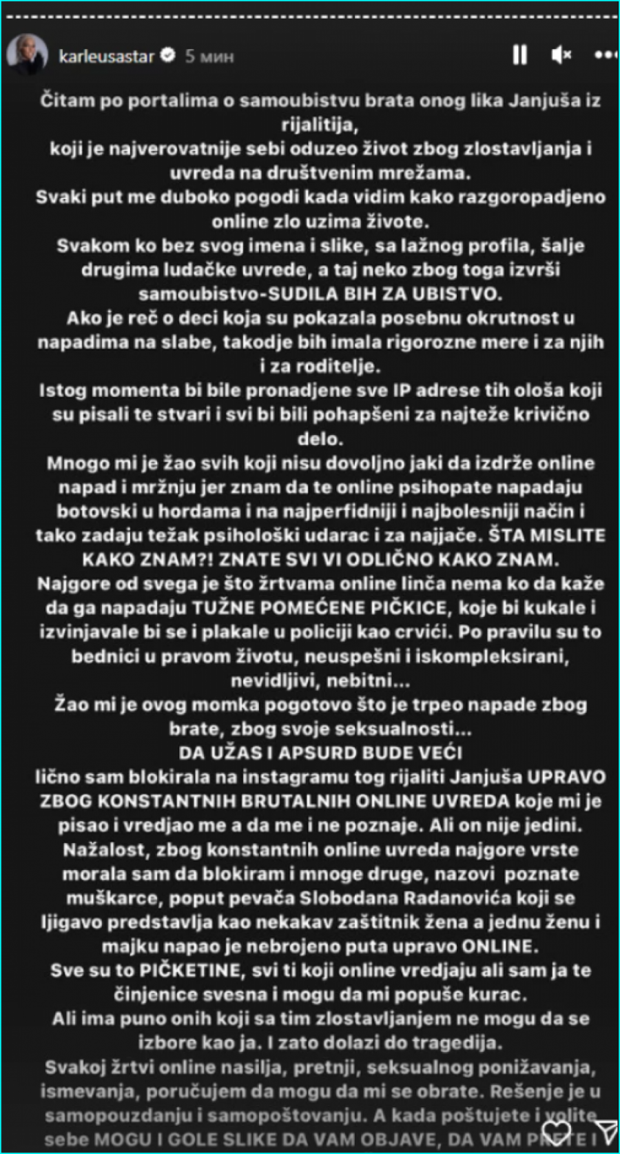 - Čitam po portalima o samoubistvu brata onog lika Janjuša iz rijalitija, koji je najverovatnije oduzeo sebi život zbog zlostavljanja i uvreda na društvenim mrežama. Svaki put me duboko pogodi kada vidim kako razgoropađeno onlajn zlo uzima živote. Svakom ko bez svog imena i slike, sa lažnog profila, šalje drugima ludačke uvrede, a taj neko zbog toga izvrši samoubistvo - sudila bih za ubistvo. Ako je reč o deci, koja su pokazala posebnu okrutnost u napadima na slabe, takođe bih imala rigorozne mere i za njih i za roditelje. Istog momenta bi bile pronađene sve IP adrese tih ološa, koji su pisali te stvari i svi bi bili pohapšeni za najteže krivično delo. Mnogo mi je žao svih, koji nisu dovoljno jaki da izdrže onlajn napad i mržnju, jer znam da te psihopate napadaju botovski, u hordama, na najbolesniji mogući način. Šta mislite, kako znam? Znate svi odlično kako znam. Žao mi je ovog dečka, pogotovo što je trpeo napade zbog svog brata, zbog svoje se*sualnosti. Da užas i apsurd bude još veći, upravo sam tog Janjuša blokirala zbog konstantnih, brutalnih onlajn uvreda, koje mi je pisao, a nije me ni poznavao - napisala je Jelena Karleuša, pa objasnila kroz šta je ona prošla.