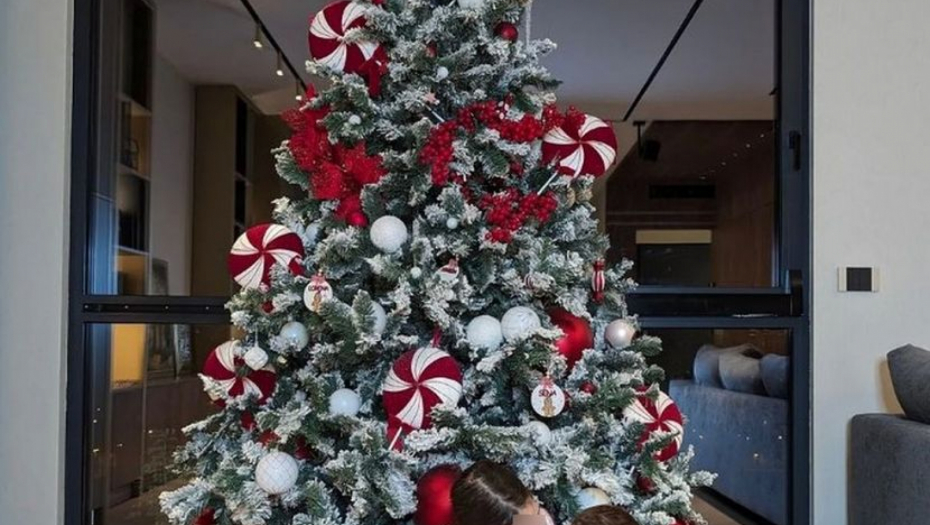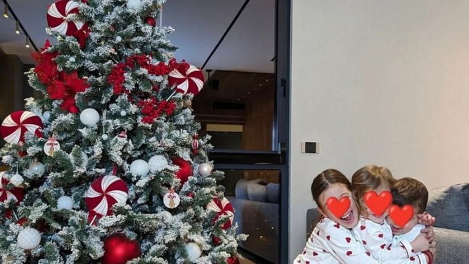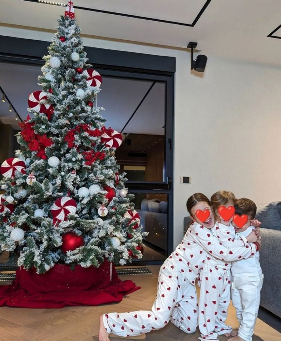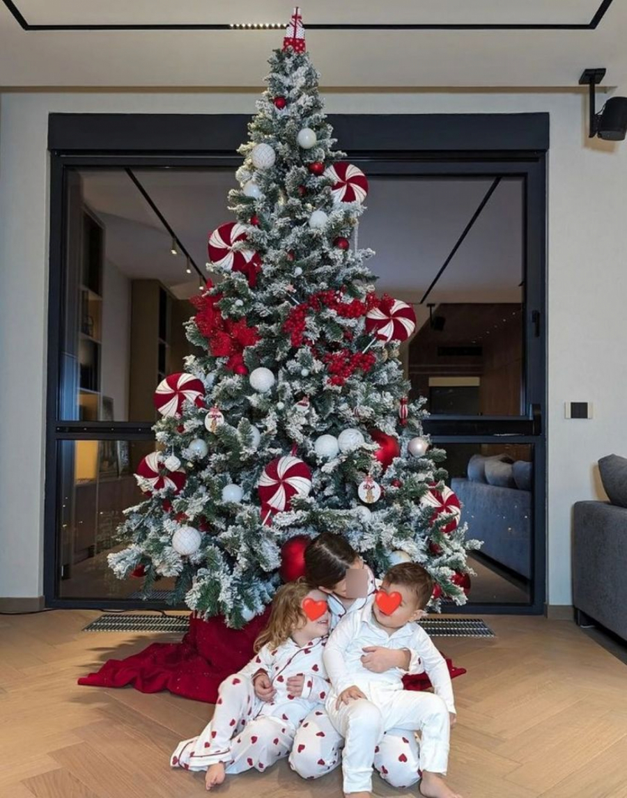 Jelka izgleda magično, u crveno-belim tonovima, sa specijalnim ukrasima u obliku lizalica, a njena deca su pozirala pored u novogodišnjim pidžamama.