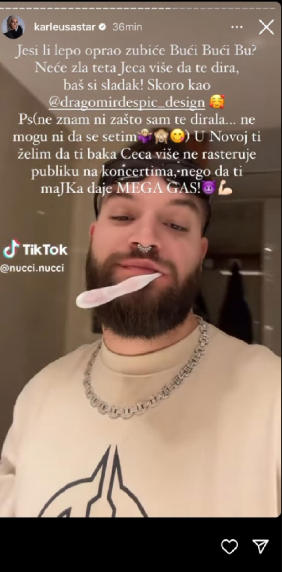 - Jesi li lepo oprao zubiće, Bući, Bući Bu? Neće zla teta Jeca više da te dira, baš si sladak. Skoro kao Desingerica. Ne znam ni zašto sam te dirala, ne mogu da se setim. U novoj godini ti želim da ti baka Ceca više ne rasteruje publiku na koncertima, nego da ti maJKa daje mega gas - napisala je Karleuša u svom stilu.