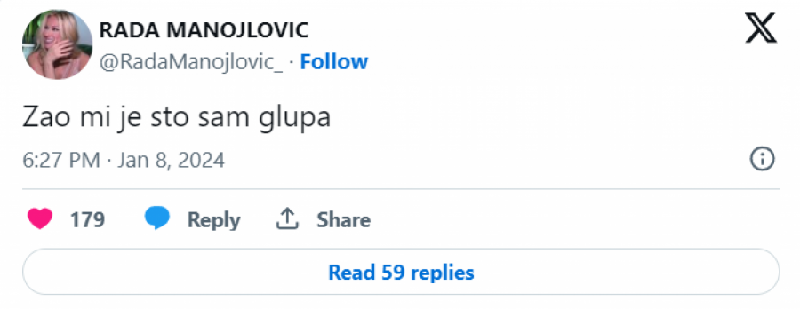 ŽAO MI JE ŠTO SAM GLUPA: Rada Manojlović se oglasila šokantnom porukom, fanovi ostali zatečeni