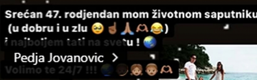 Žena pevača Peđe Jovanovića, Ana Jovanović čestitala je suprugu rođendan veoma emotivnom porukom. To je stoga definitivno dokaz da su oni nastavili brak i vezu koji je bio na pauzi zbog njegovog problema sa pićem.