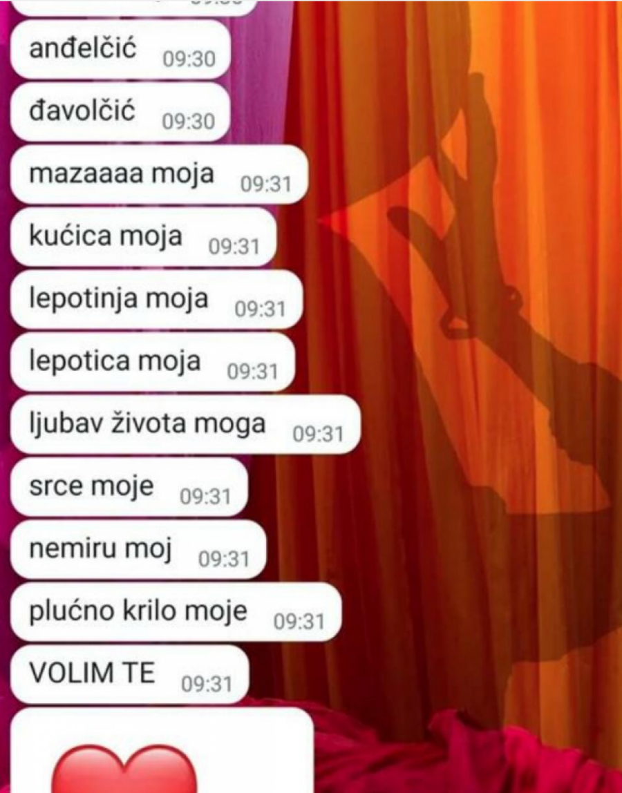 - Sunce, život moj, vrat moj, anđeo moj, anđelčić, đavolčić, maza moja, kućica moja, lepotinja moja, lepotica moja, ljubav života moga, srce moje, nemiru moj, plućno krilo moje. Volim te - napisao je biznismen Jovani, što je nju potpuno razoružalo.