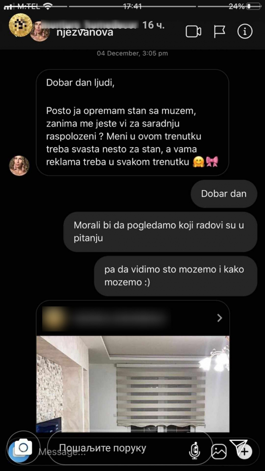 Ona im je napisala da ima u planu da oprema stan sa suprugom, a njih je pitala da li su raspoloženi za saradnju, budući da paru treba svašta nešto za stan, a njima treba svakako dobra reklama, kako ona kaže.