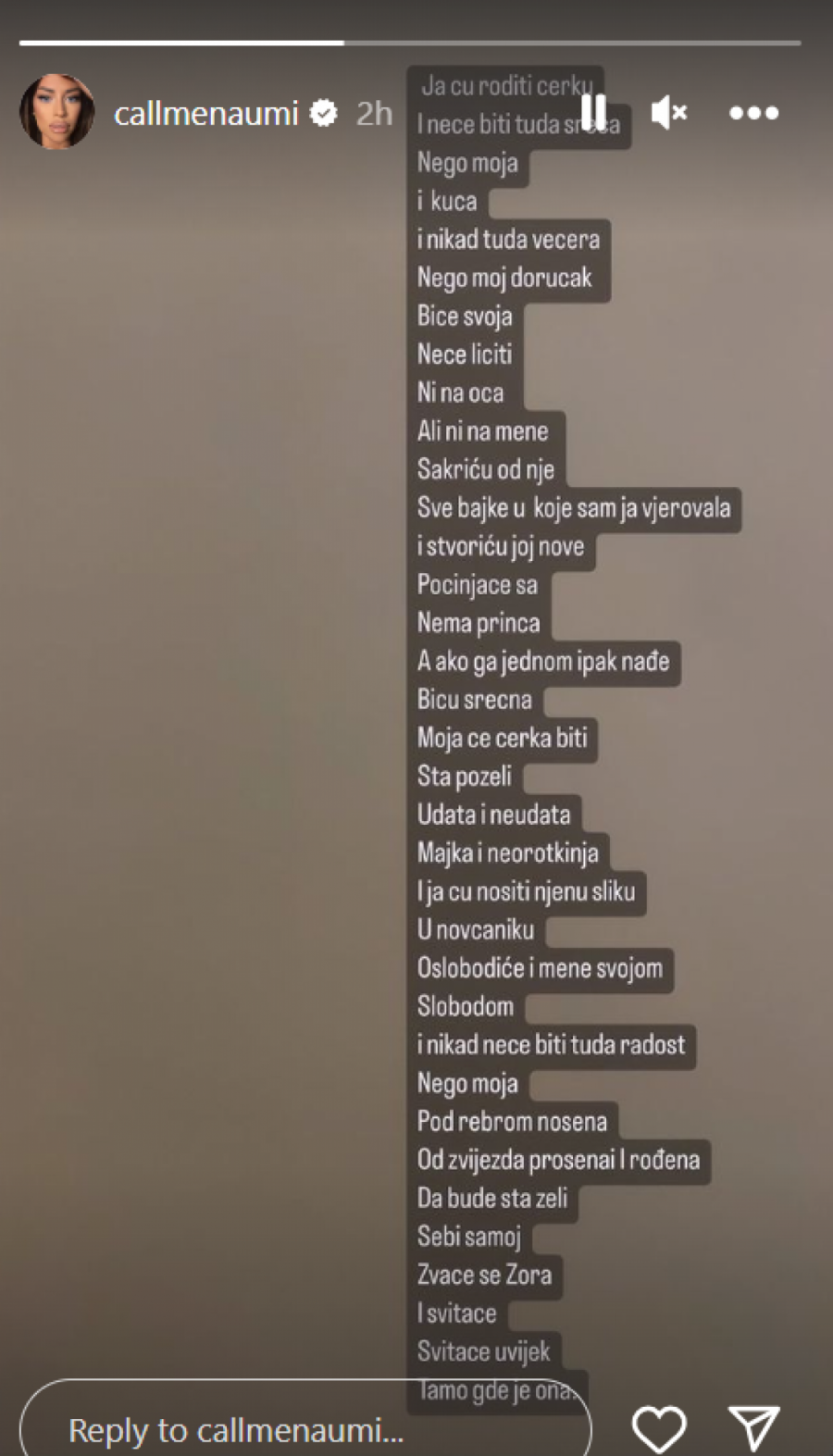 - Moja će ćerka biti šta poželi, udata i neudata, majka i nerotkinja, i ja ću nositi njenu sliku u novčaniku. Oslobodiće i mene svojom slobodom i nikada neće biti tuđa radost, nego moja. Pod rebrom nošena, od zvezda prošena i rođena. Da bude šta želi sebi samoj. Zvaće se Zora i svitaće. Svitaće uvek tamo gde je ona - pisalo je Mininoj objavi.