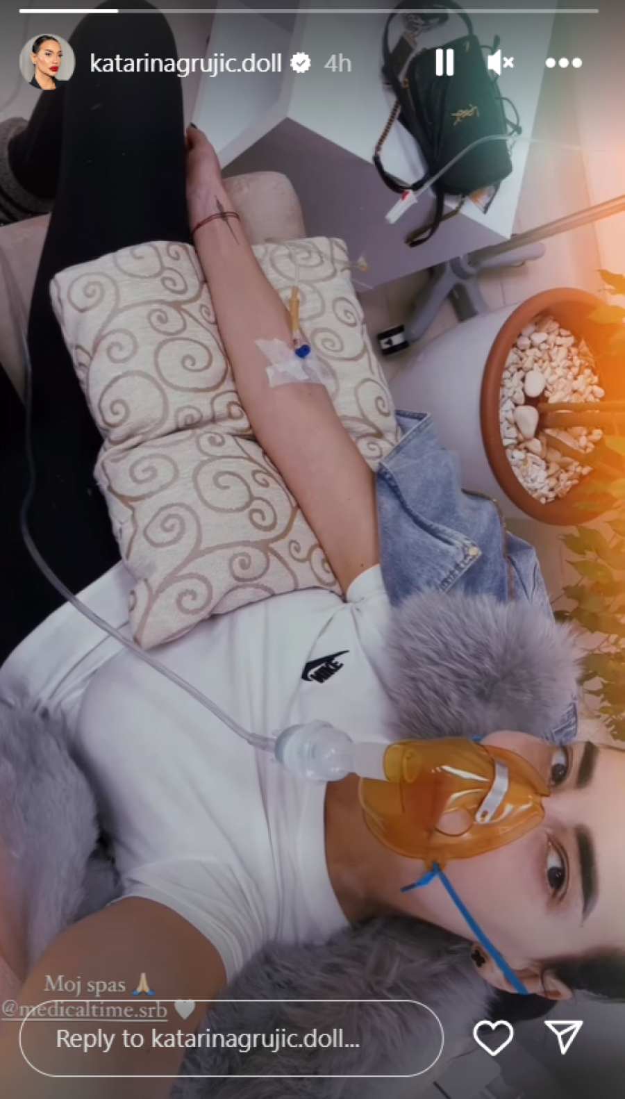 Naime, Kaća je objavila fotku sa klinike na kojoj se jasno vidi da je priključena na infuziju, kao i da se istovremeno inhalira. Ona je u opis fotke kratko napisala: