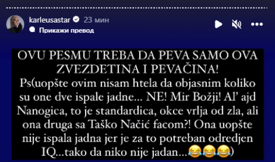 Naime, Jelena se oglasila na Instagramu i napisala da nije fer što su pojedini napali Selmu zbog pokazivanja dvoglavog orla, a Teu nisu, koja je na svom nastupu na Trgu, za doček Srpske Nove godine, kako Karleuša kaže, pevala albanske pesme.