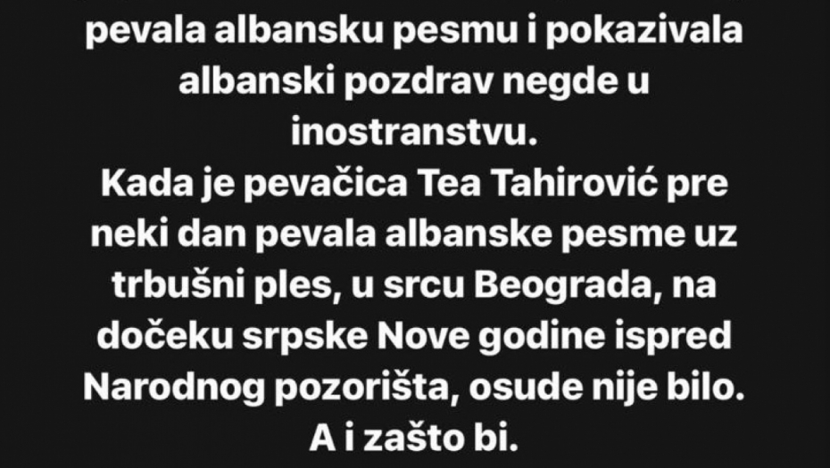 - Moramo da budemo fer i stvari nazivamo pravim imenom. Naši srpski mediji osudili su vrsnu pevačicu Selmu Bajrami, zato što je (kao žena albanskog porekla), pevala albansku pesmu i pokazivala albanski pozdrav negde u inostranstvu. Kada je pevačica Tea Tahirović pre neki dan pevala albanske pesme uz trbušni ples, u srcu Beograda, na dočeku Srpske Nove godine ispred Narodnog pozorišta, osude nije bilo. A i zašto bi. Muzika spaja i ne poznaje granice. Beograd je metropola i otvoren je za sve ljude. Ali... Zašto se jedna osuđuje, a druga ne? Ne smemo biti licemerni - napisala je Jelena na Instagramu.
