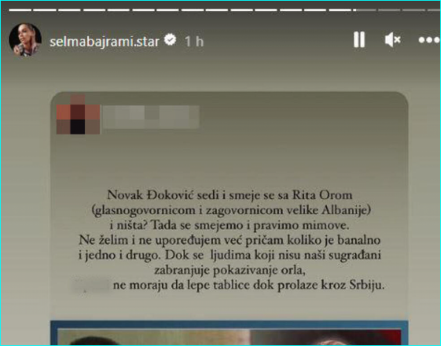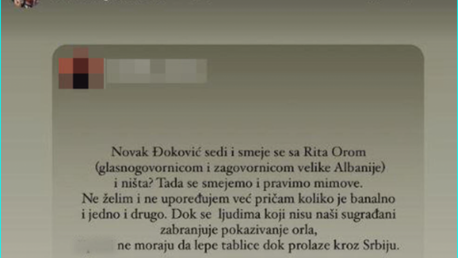 - Novak Đoković sedi i smeje se sa Rita Orom (glasnogovornicom i zagovornicom velike Albanije) i ništa? Tada se smejemo i pravimo mimove. Ne želimo i ne upoređujemo već pričam koliko je banalno i jedno i drugo. Dok se ljudima koji nisu naši sugrađani zabranjuje pokazivanje orla, š..... ne moraju da lepe tablice dok prolaze kroz Srbiju - glasi stav koji je podelila, i očigledno podržala.