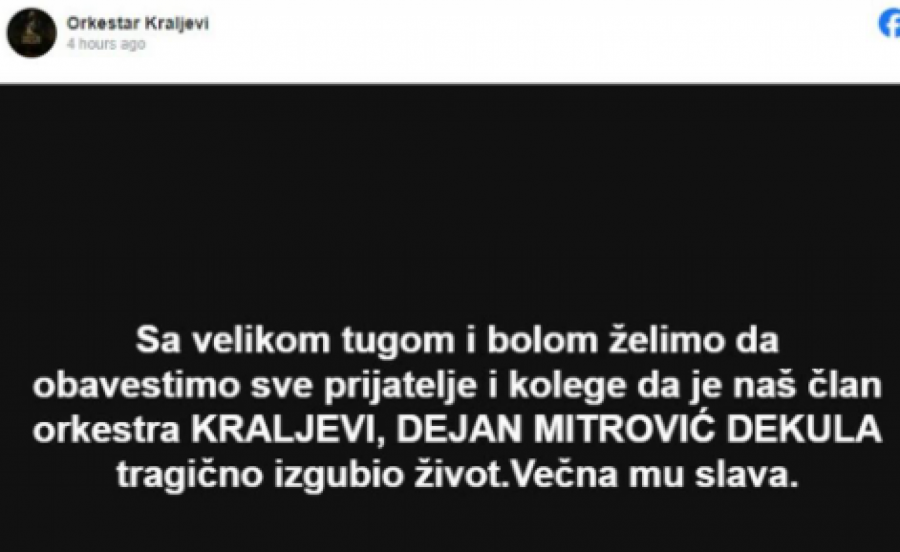 - Sa velikom tugom i bolom želimo da obavestimo sve prijatelje i kolege da je naš član orkestra "Kraljevi", Dejan Mitrović Dekula, tragično izgubio život. Večna mu slava - piše u objavi.