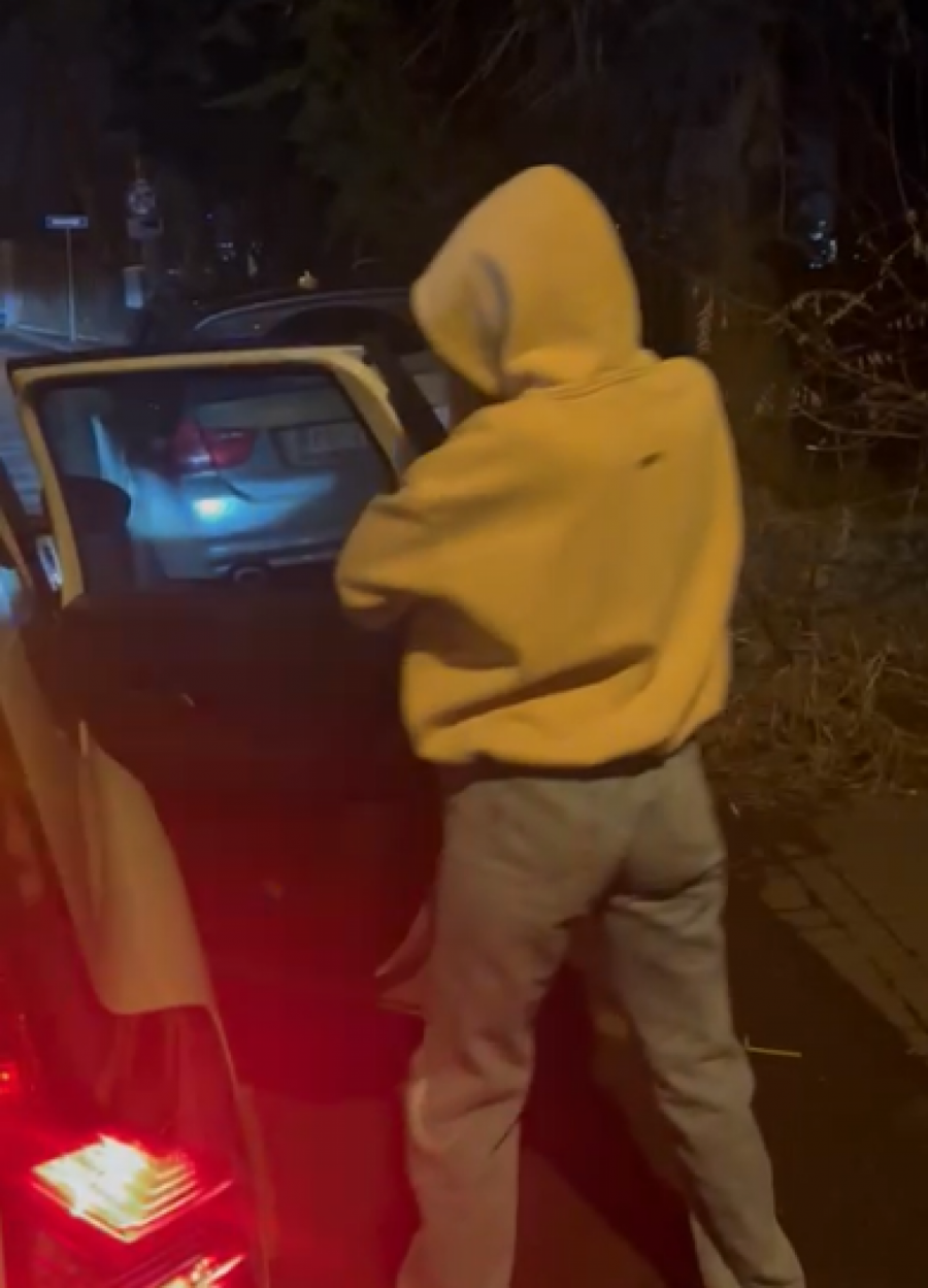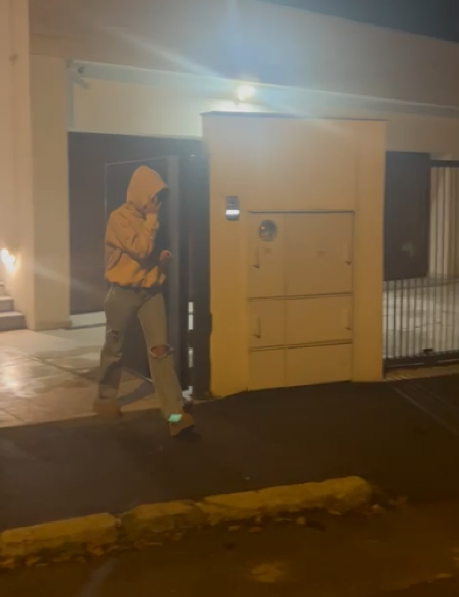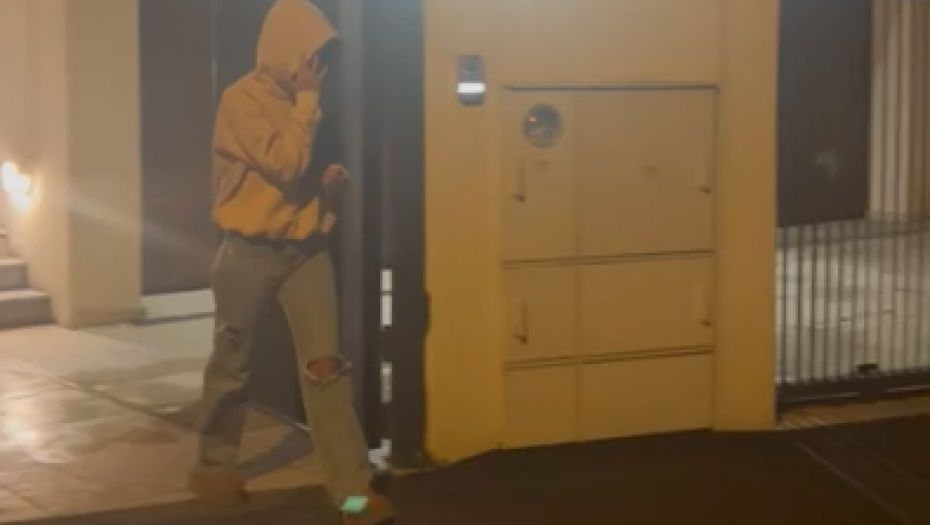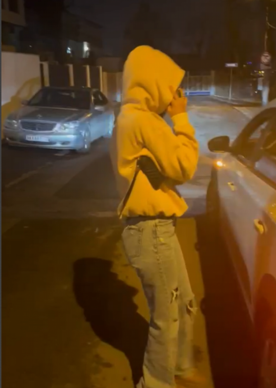 Ona je otvorila kapiju i ušla u automobil, sve vreme sa kapuljačom na glavi, a potom se odvezla u nama nepoznatom pravcu, ne želeći da komentariše razvod roditelja.