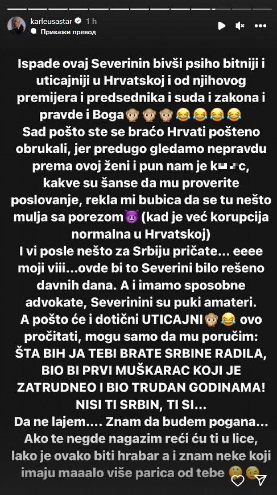- Sad, pošto ste se braćo Hrvati pošteno obrukali, jer predugo gledamo nepravdu prema ovoj ženi i pun nam je ku*ac, kakve su šanse da mu proverite poslovanje, rekla mi bubica da se tu nesto mulja sa porezom (kad je već korupcija normalna u Hrvatskoj). I vi posle nešto za Srbiju pričate... Eeee moji viii... Ovde bi to Severini bilo rešeno davnih dana, a i imamo sposobne advokate, Severinini su puki amateri. A pošto će i dotični uticajni ovo pročitati, mogu samo da mu poručim: Šta bih ja tebi brate Srbine radila, bio bi prvi muškarac koji je zatrudneo i bio trudan godinama! Nisi ti Srbin, ti si... Da ne lajem, znam da budem pogana... Ako te negde nagazim reći ću ti u lice, lako je ovako biti hrabar, a i znam neke koji imaju maaalo više parica od tebe - napisala je očito besna Jelena, koja veoma burno reaguje na nepravdu i maltretiranje žena, ali i manjina.