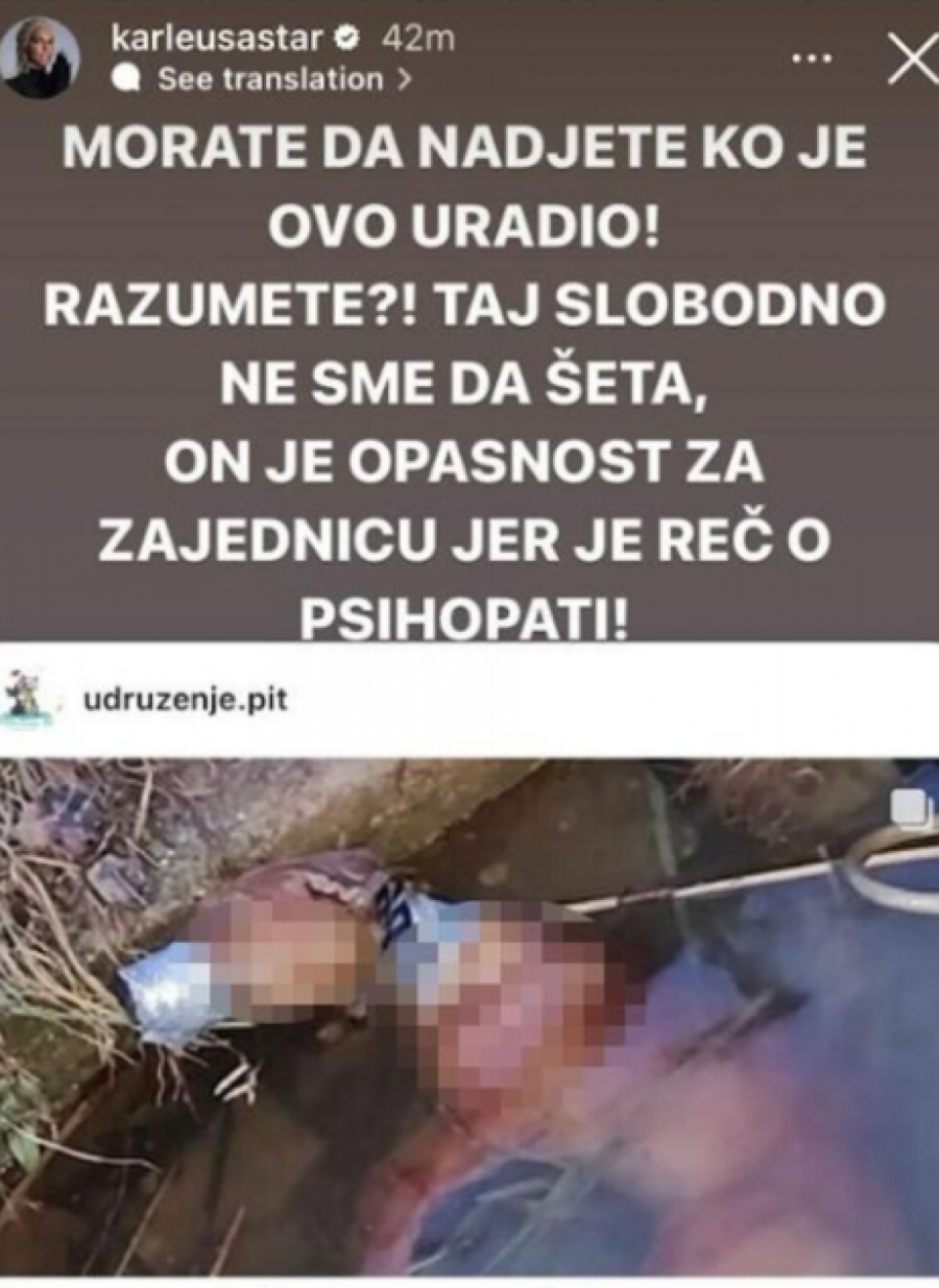 Na snimku koji je podelila sa jedne stranice se vidi vezano, mrtvo kuče, a Karleuša je apelovala na nadležne službe nađu što pre počinioca.