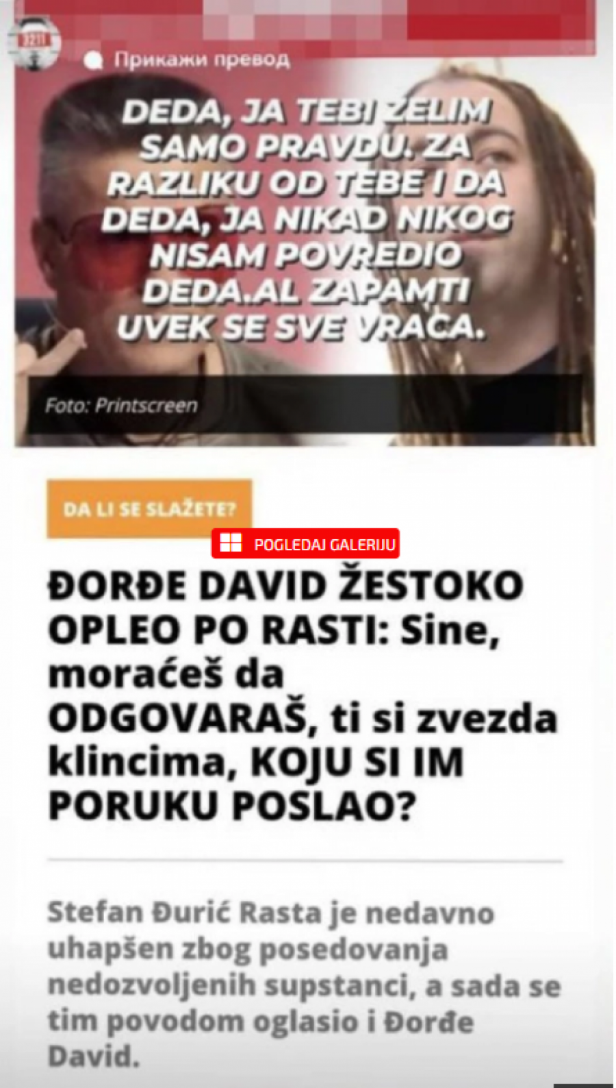 - Deda, ja tebi želim samo pravdu. Za razliku od tebe, ja nikoga nikada nisam povredio, deda. Ali zapamti, uvek se sve vraća - napisao je Rasta.