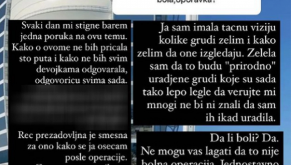 - Svaki dan mi stigne barem jedra poruka na ovu temu. Kako o ovome ne bih pričala sto puta i kako ne bih svim devojkama odgovarala, odgovoriću svima sada. Reč prezadovljna je smešna za ono kako se ja osećam posle operacije. Za mene su to najlepše urađene grudi, neću biti skromna - napisala je Teodora pa nastavila.
