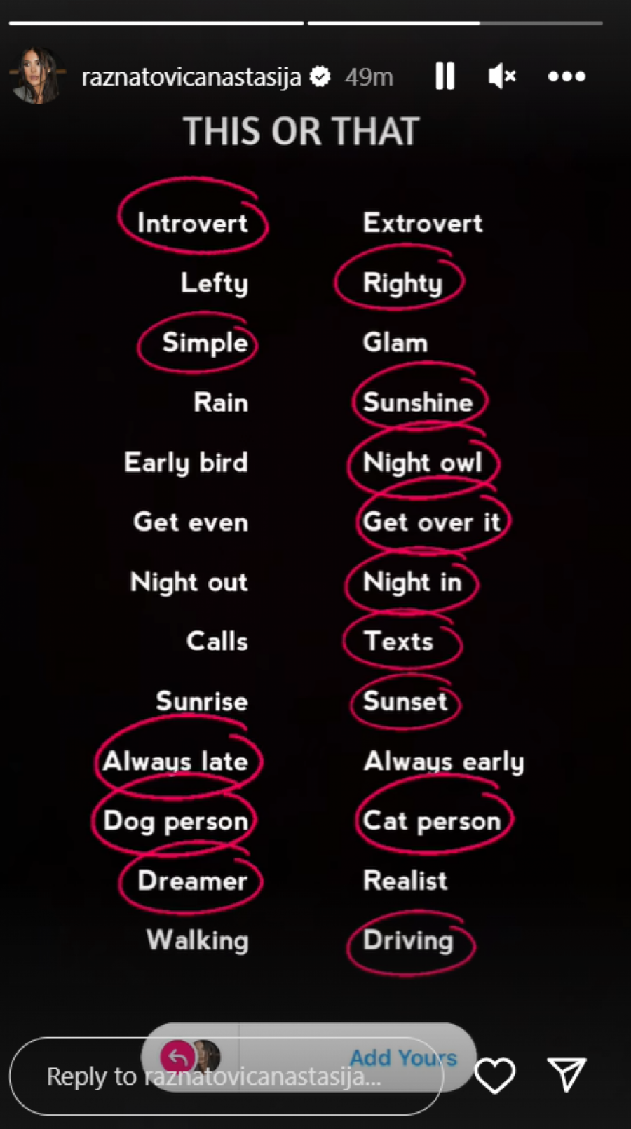 Naime, ona je prihvatila Instagram anketu sa spiskom osobina i navika, te sklonosti i pritom označila one upečatljive koje se odnose na nju.
