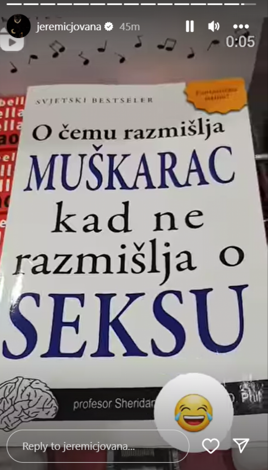 Naime, Jovana je objavila korice knjige koju je počela da čita, a naslov iste je "O čemu razmišlja muškarac kada ne razmišlja o se*su". U pozadini fotke koju je Jovana objavila išla je pesma Cece Ražnatović "Šta je to u tvojim venama, štio te tera drugim ženama".