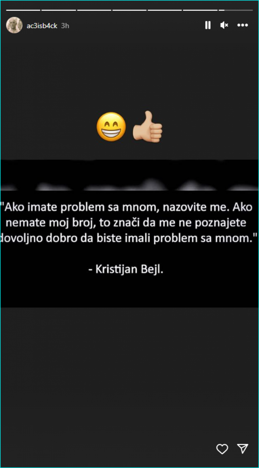 - Ako imate problem sa mnom, nazovite me. Ako nemate moj broj, to znači da me ne poznajete dovoljno dobro da biste imali problem sa mnom - stoji u objavi koju je podelio Veljko.
