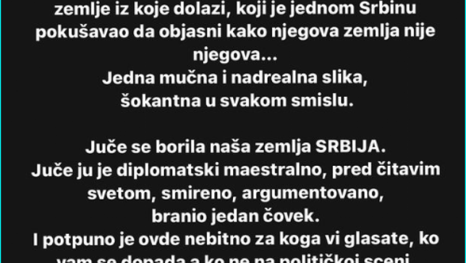 - Juče se borila naša zemlja Srbija. Juče ju je, diplomatski maestralno , pred čitavim svetom, smireno, argumentovano, branio jedan čovek. I potpuno je ovde nebitno za koga vi glasate, ko vam se dopada, a ko ne na političkoj sceni, ovo je da skine kapu svako ko se oseća kao Srbin. Na momenat mi je bilo i potresno, jer je tema bila odbrana pravde - napisala je Karleuša, koja je potom dodala šta očekuje od naroda slogu.