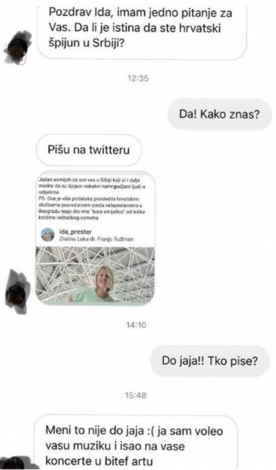 - Pozdrav Ida, imam jedno pitanje za vas. Je li istina da ste hrvatski špijun u Srbiji? - glasila je prva poruka fana, a pevačica mu je zatim odgovorila: