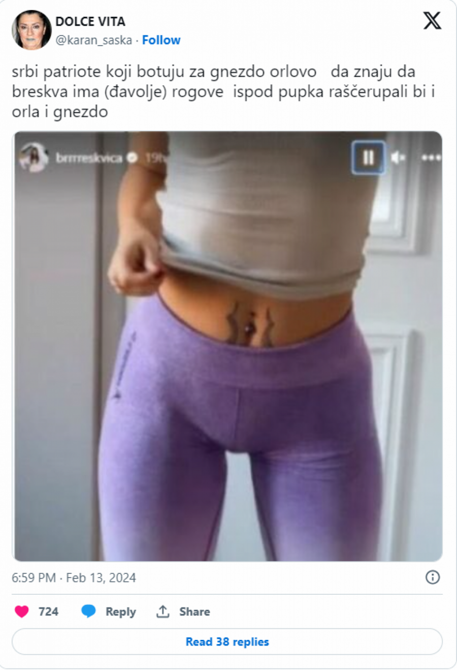 Sada je Breskvica u centru pažnje korisnika mreže X zbog tetovaže. Na slici objavljenoj na pomenutoj društvenoj mreži, vidi se pevačica u ljubičastim helankama iz kojih vire dva roga, tačnije deo tetovaže na donjem stomaku. Korisnik koji je objavio sliku napisao je da bi Srbi patriote, kada bi znali da ima istetovirane rogove, raščerupali i orla i gnezdo, nakon čega su komentari krenuli da se nižu:
