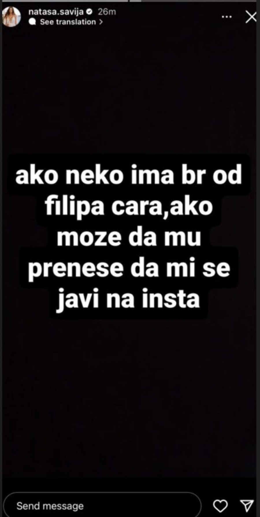 – Ako neko ima broj Filipa Cara, ako može da mu prenese da mi se javi na Insta – napisala je Šavija u okviru objave koju je brzo uklonila.