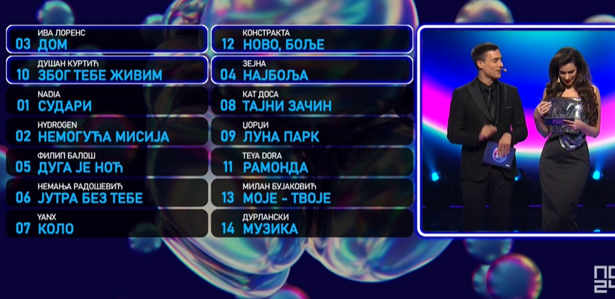 Podsetimo, tokom večerašnjeg takmičenja 14 izvođača boriće se za prolazak u veliko finale, a potom i za predstavljanje Srbije na Evroviziji u Švedskoj i to ovim redosledom: